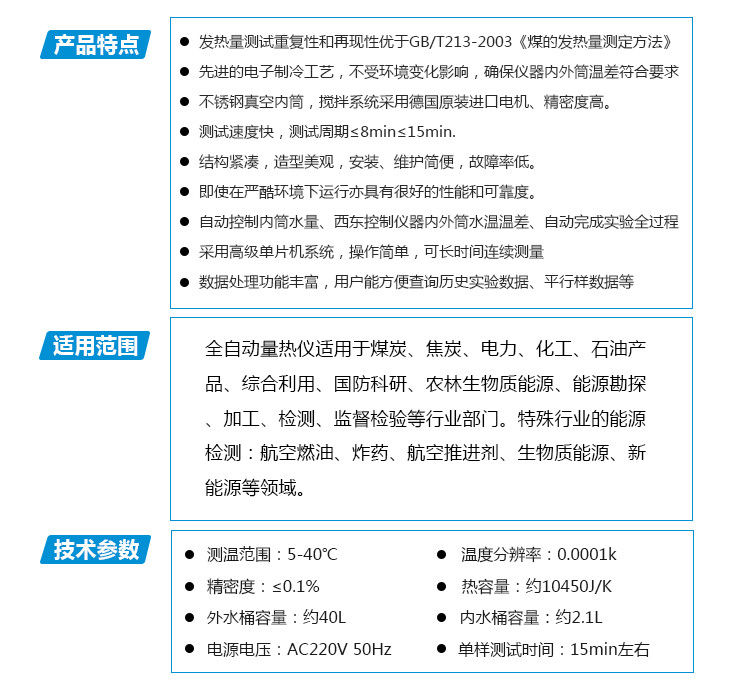 適用于電力、**、冶金、石化、環保、水泥、造紙、地堪、科研院校等行業部門測量**、焦炭及石油等可燃物質的發熱量,符合國標GB/T213-2008《煤的發熱量測定方法的要求》及GB/T 14402-2007《建筑材料及制品的燃燒性能、燃燒熱值的測定》。