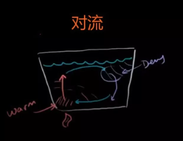 在火焰上方的水比其他地方更熱,加熱的水分子加速運動,增加了彼此間的距離,所以該處的密度減小,周圍物質就相對更密集。熱的、密度小的水向上運移,下方就有更冷的水從另一端移動過來補充,這就形成了一個循環:熱的水上升移動到右上方,之后由于降溫密度增大而下沉,然后再次被加熱。這個過程本質上是熱傳遞,稱為對流。