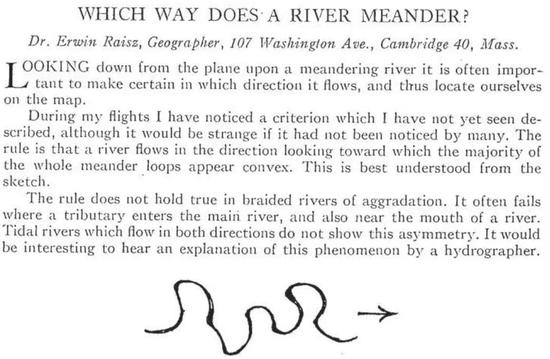 其實(shí)早在1955年,就有人在飛機(jī)上觀察大地上的“蛇曲”,并發(fā)現(xiàn)了發(fā)育到晚期的彎頭具有偏向上游扭曲的趨勢(shì)。下面這張圖貼出的就是當(dāng)時(shí)闡述這一現(xiàn)象的文章全文。