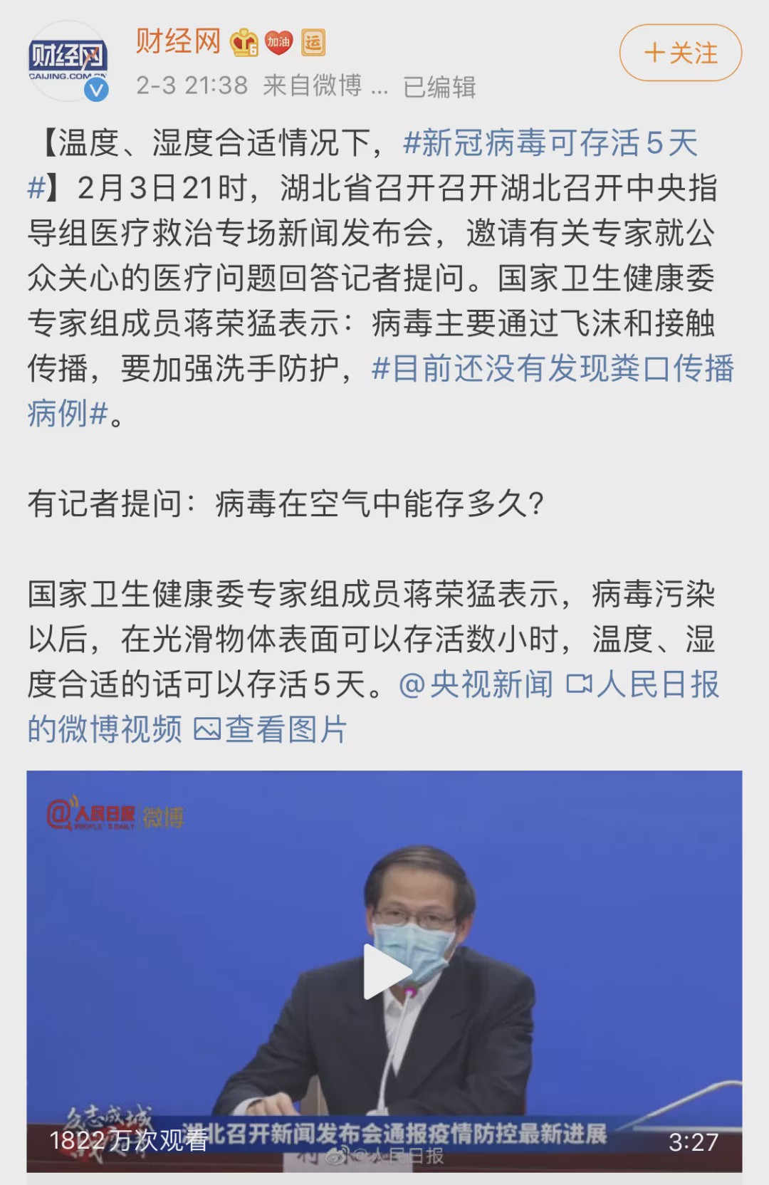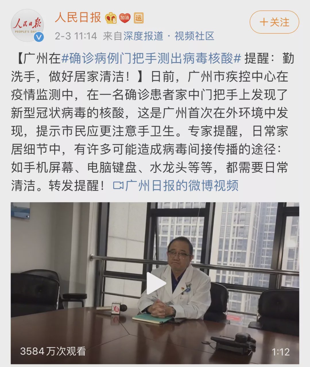 國家衛健委專家針對這個問題專門做了解釋,說溫度濕度適宜的情況下,病毒體外可存活五天,這不是一個樂觀的消息。