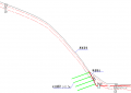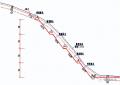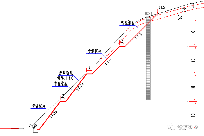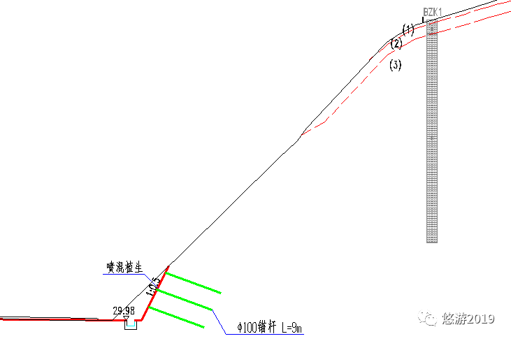 該方案的邊坡坡口線距直徑1.5m的輸油管線水平距離只有7m,安全隱患非常大。若結合實際地質資料、輸油管線這個控制性構筑物進行收坡,則邊坡高度由44.3m降低為34.4m,邊坡坡口線距輸油管線的水平距離加大為23m,工程的安全性大幅提高,優化為斷面如下: