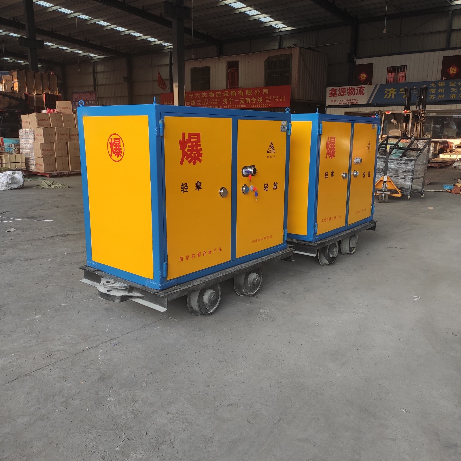 我公司生產的井下軌道火工品運輸的有軌式炸藥運輸車、軌道炸藥箱、礦車雷管箱,用移動式炸藥柜(需持有移動式爆炸危險品存放箱和防靜電報告)和礦車(煤安證或者礦安證)相結合,即符合炸藥等危險品的運輸存儲要求又符合井下軌道的運輸(礦車),可根據用戶存儲數量定制尺寸。