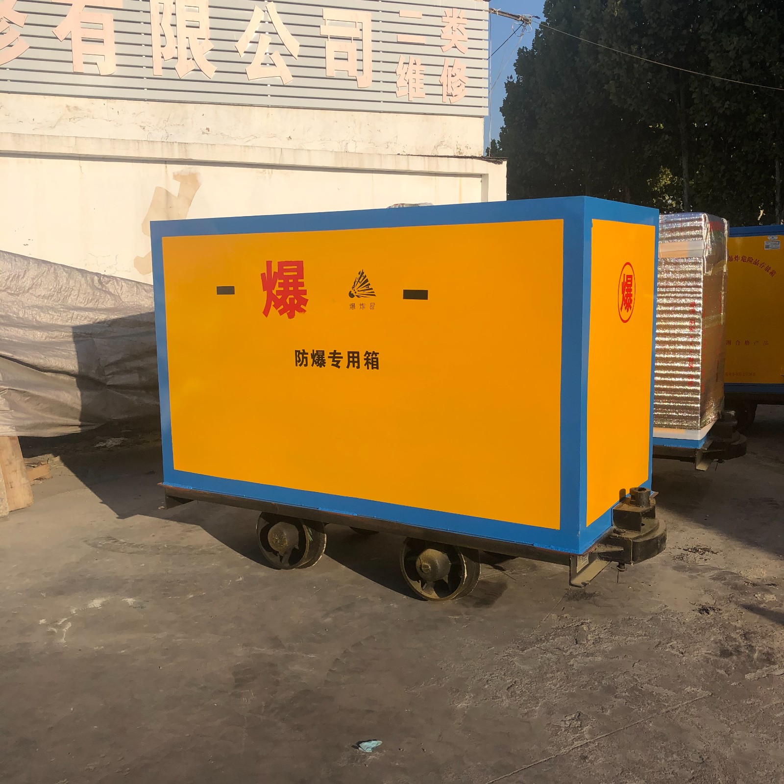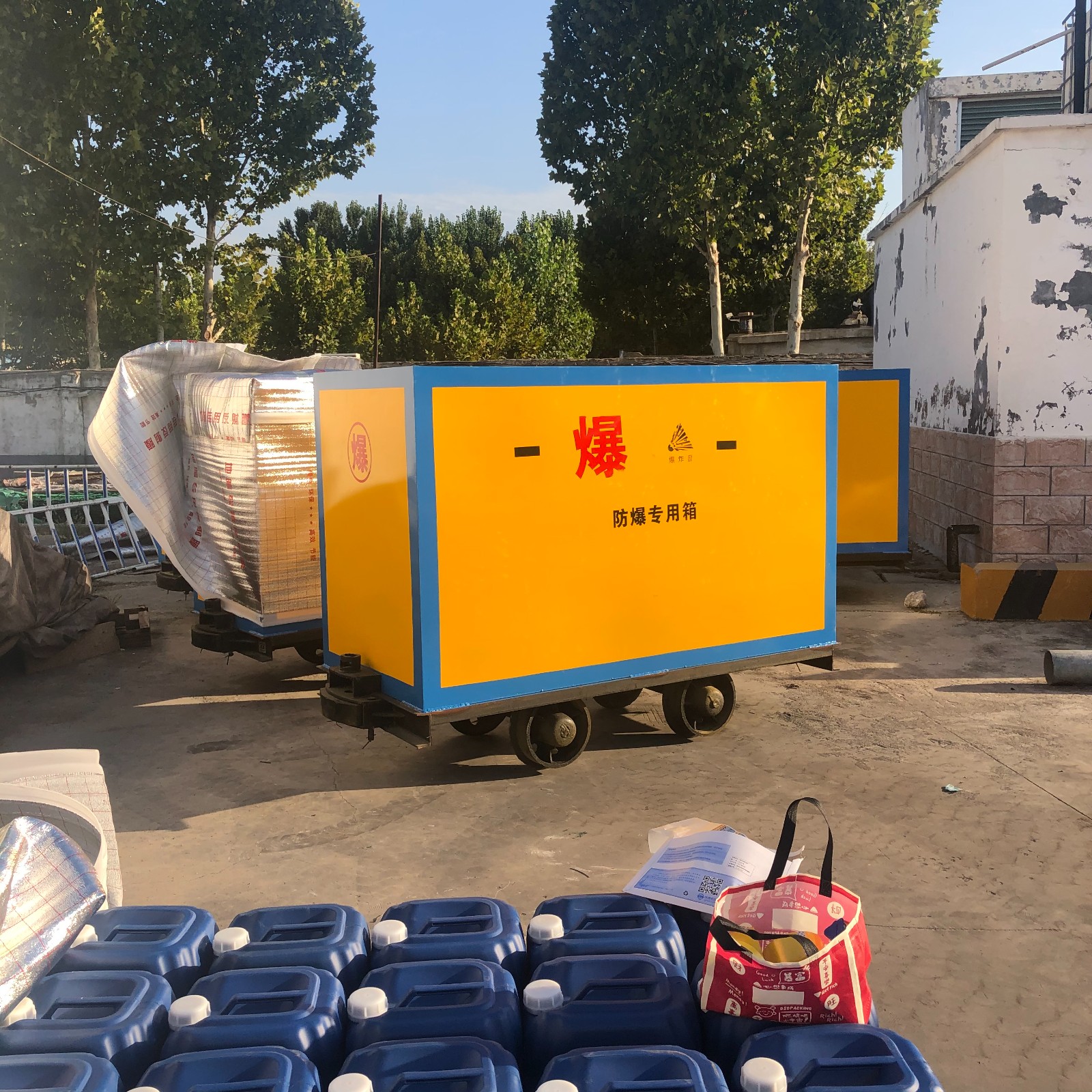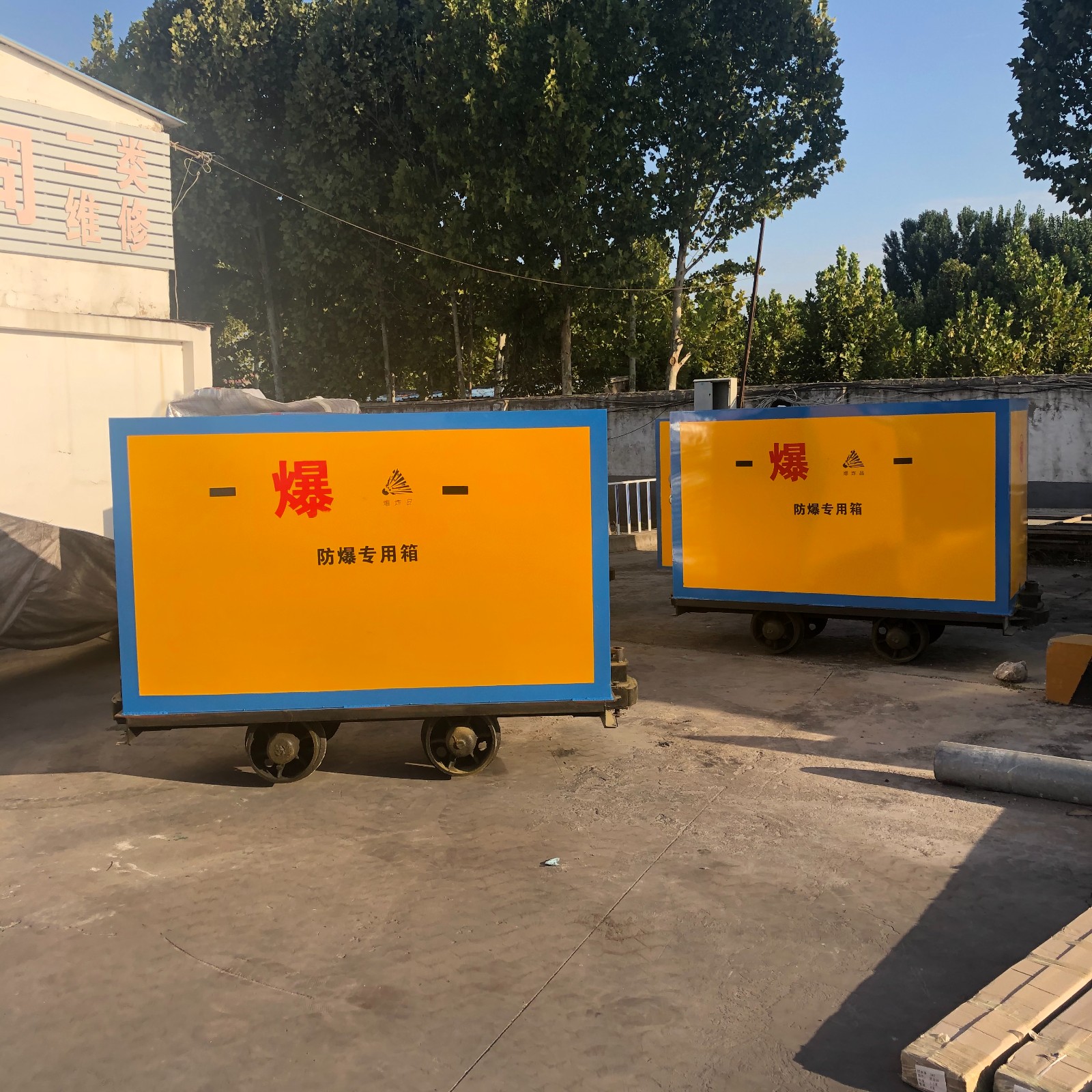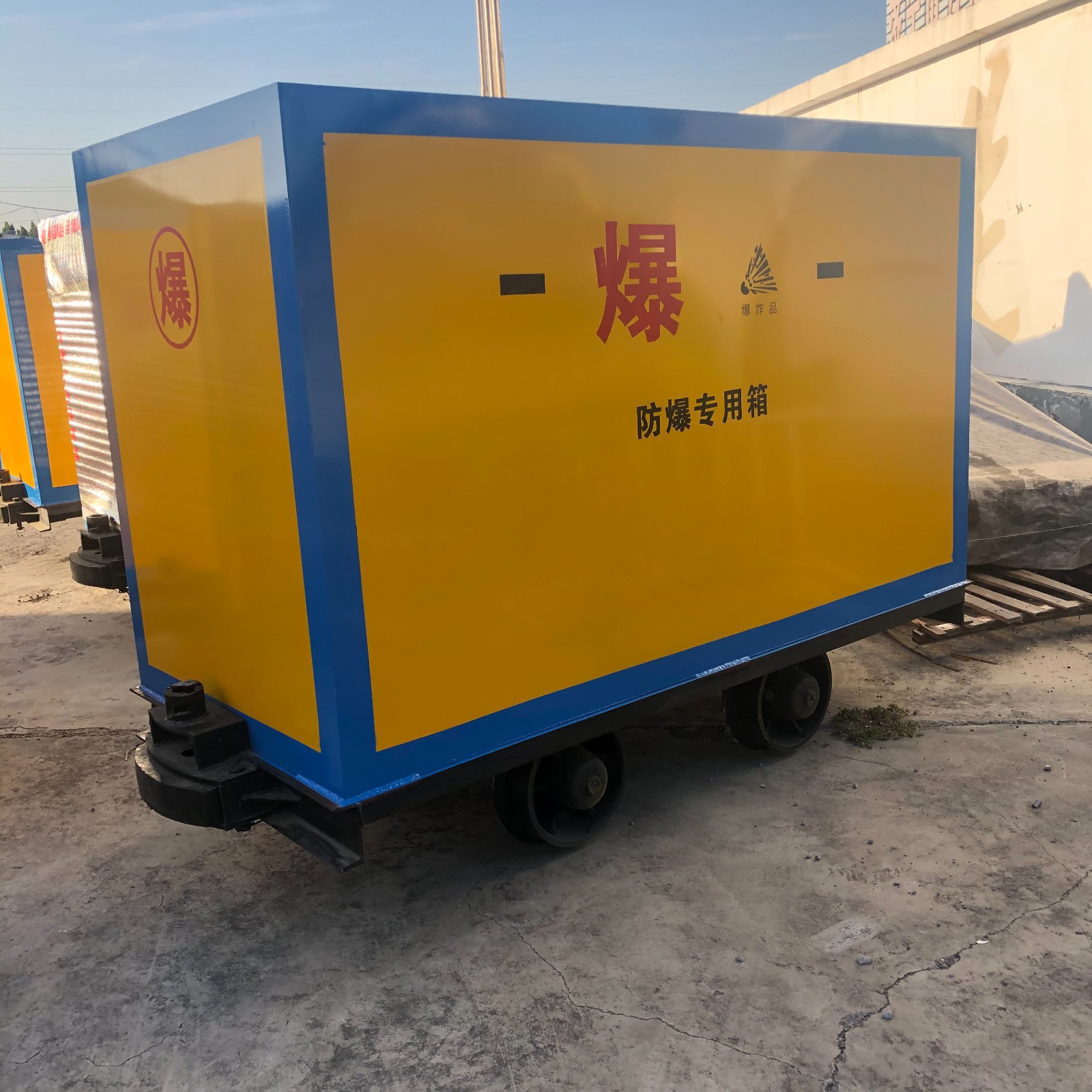 礦用軌道炸藥運輸車,主要的構成部分是:上部分是可以根據存放量來定制大小的防爆炸藥柜,除了考慮到存放量,井下的罐籠大小以及巷道的限寬和限高也是需要注意的。它是采用6-8mm(厚度)規格的鋼板制作而成,內部帶有防潮木板和抗震防靜電氈墊,下半部分是井下軌道行駛的材料車部分,材料車主要是由輪對和平板構成,將炸藥柜焊接在平板上,通過緊密焊接。連體而成為一個整體井下炸藥運輸車。