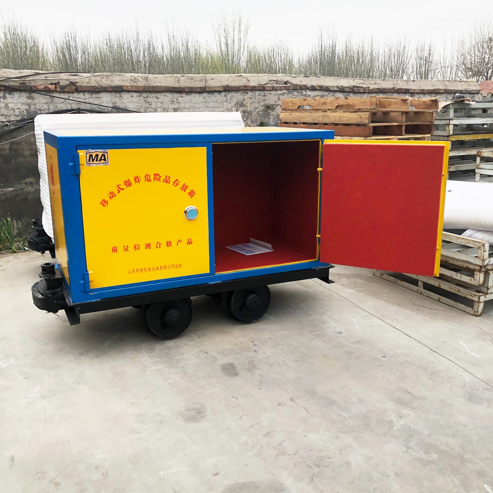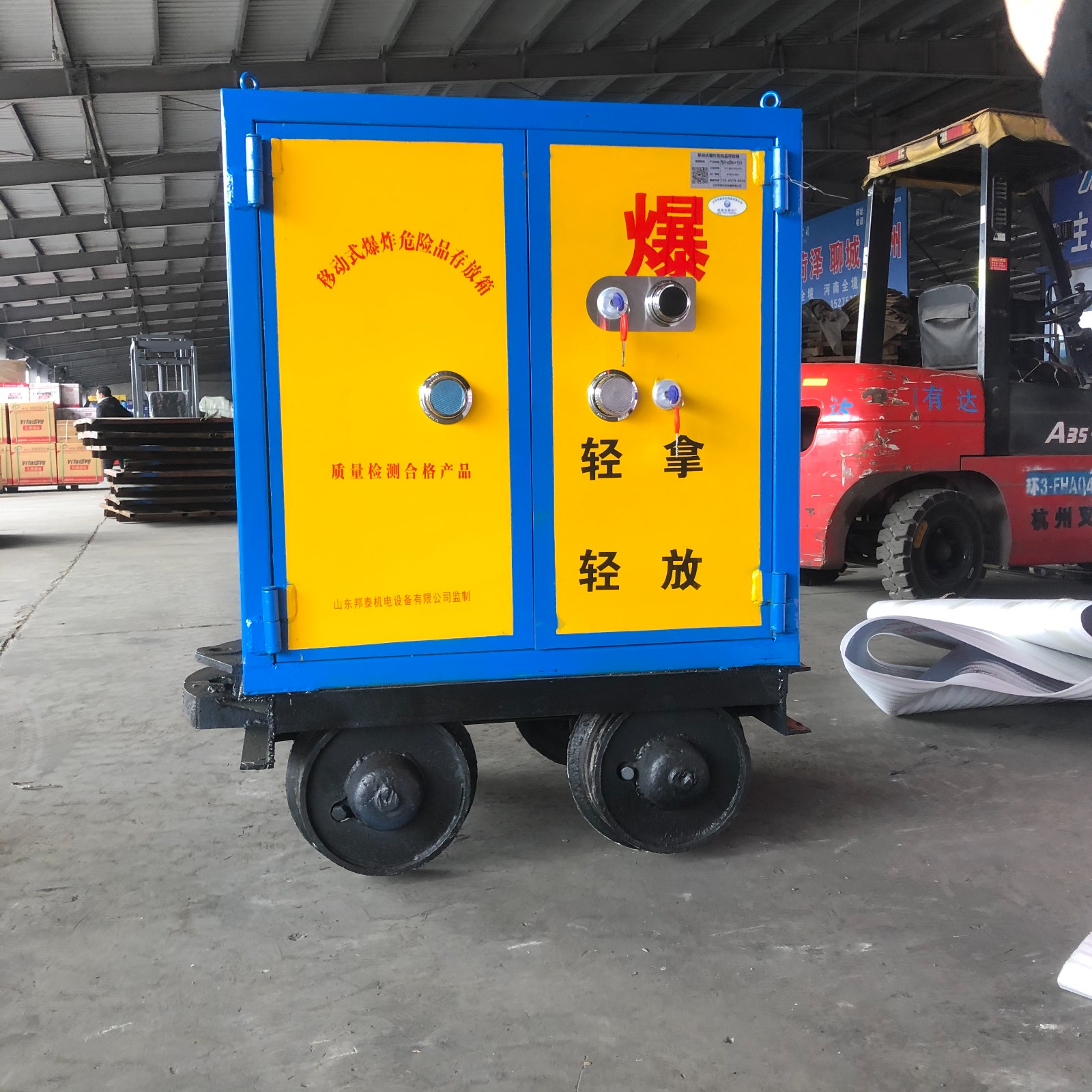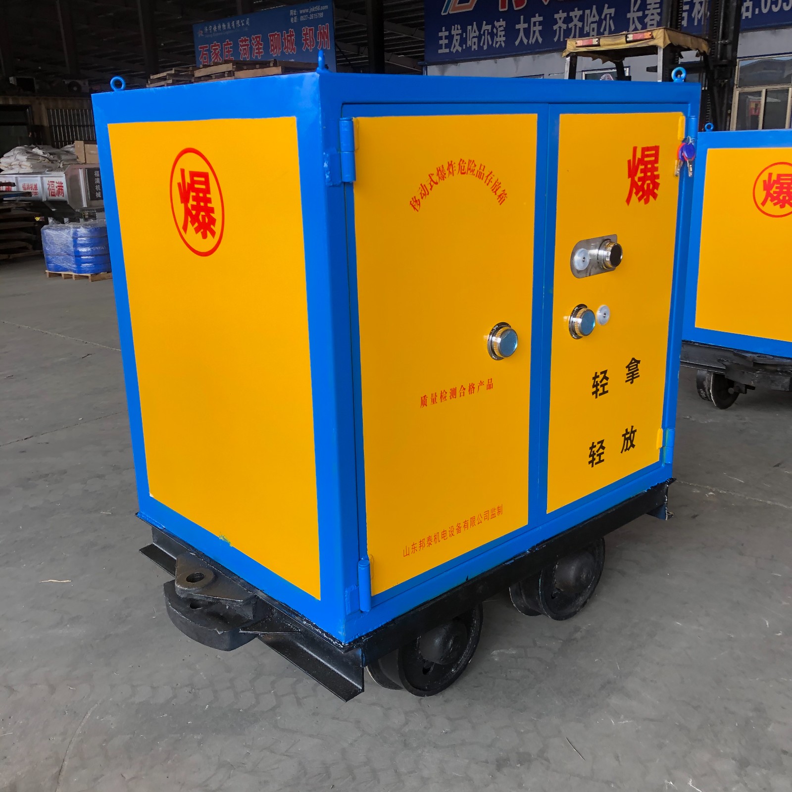 炸藥車分為兩個組成部分,上部分是存放柜體,由外到內一共有三層組成,門板最外層采用不低于6mm厚的優質鋼板制作而成,內部兩層分別是10mm厚的木板和防靜電阻燃氈墊,鎖具采用雙鎖聯動,配有兩把明鎖和一把機械密碼鎖,鑰匙由爆破人員分開保管。下部分是礦車載體,根據不同礦山軌距,可定制600mm,762mm,900mm軌距,與炸藥存儲柜緊密焊接一體,利用礦山的機車等牽引裝置來完成運輸過程。