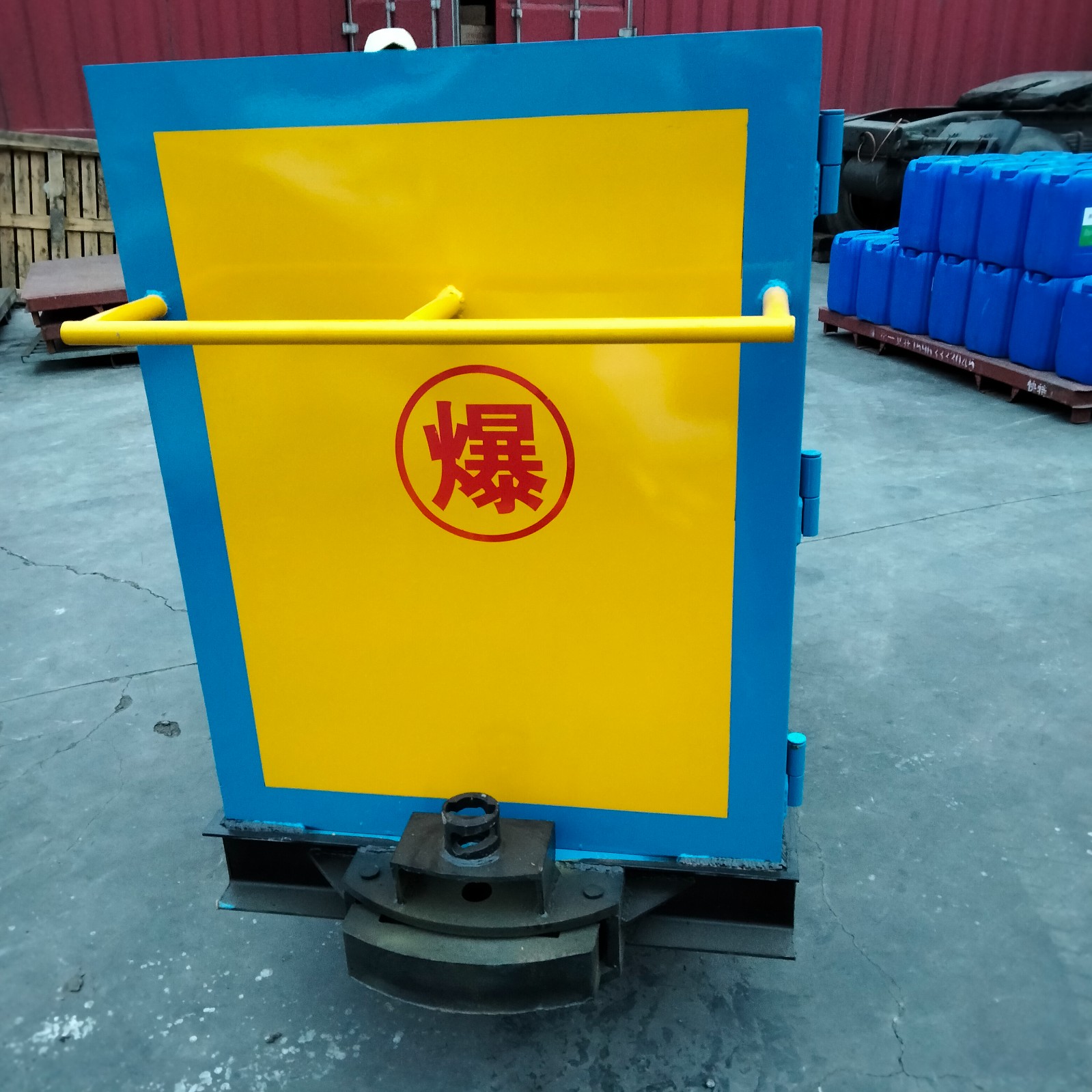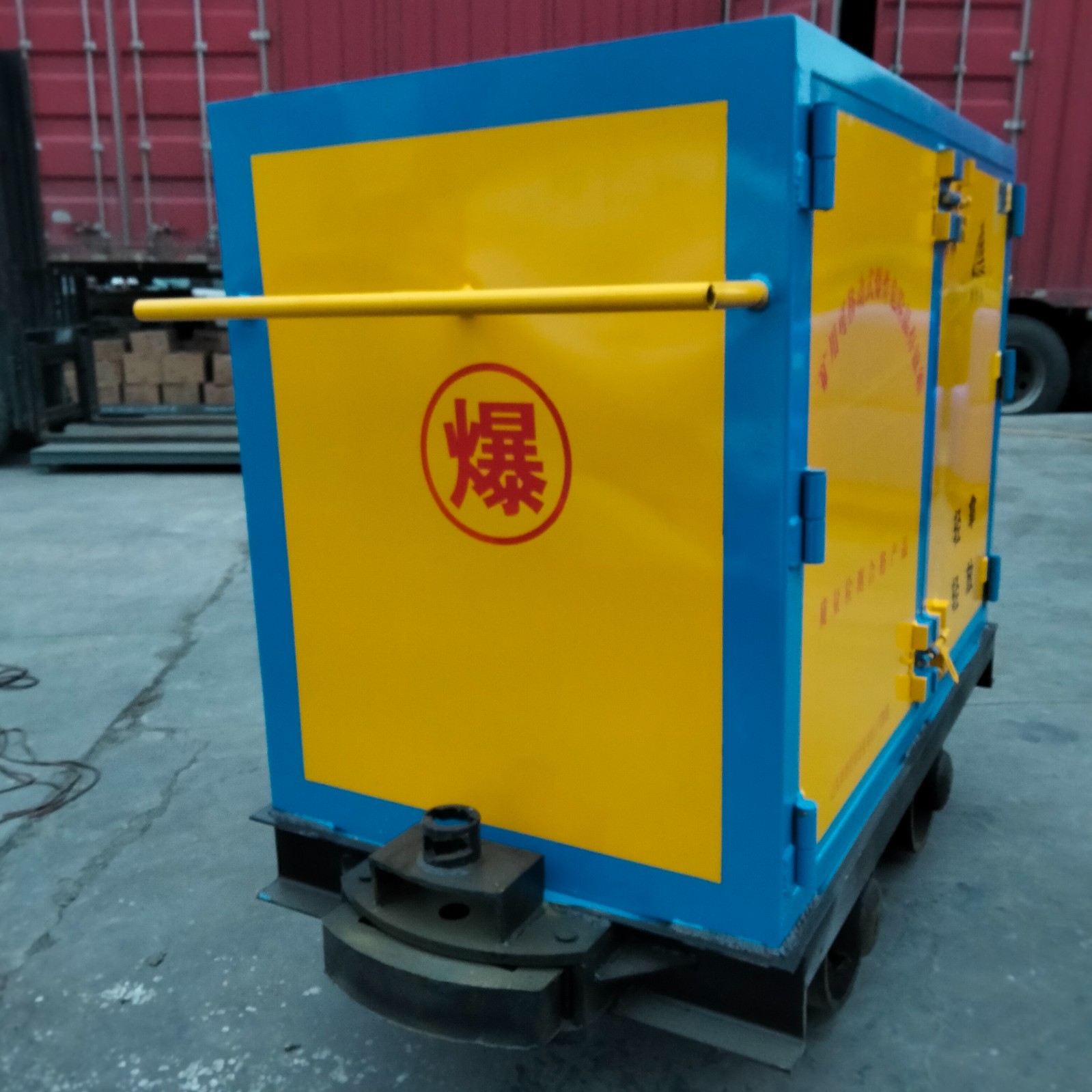 井下爆破器材運(yùn)輸車是一款兼具存儲(chǔ)和運(yùn)輸兩種功能的專用運(yùn)輸車量,可用于向井下運(yùn)輸炸藥,雷管等易燃易爆物品,配有一個(gè)機(jī)械密碼鎖和兩把明鎖,鑰匙需由爆破人員分開保管,以確保存放安全性。