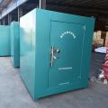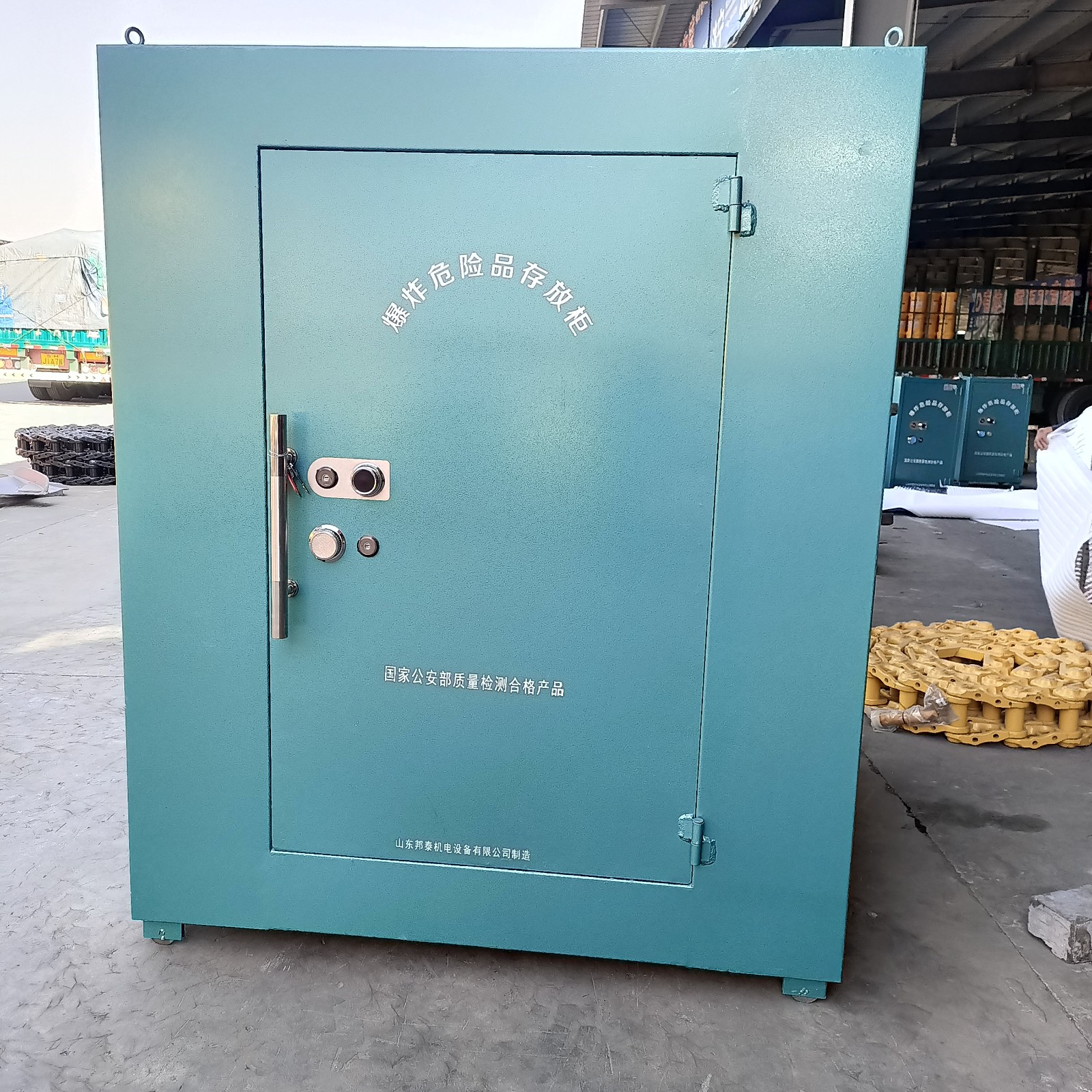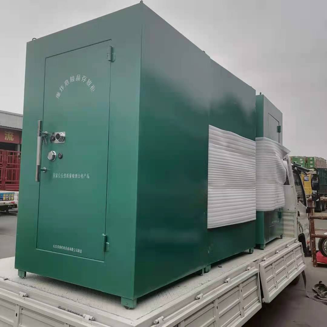山東邦泰生產的火工品臨時存放庫,主體是由優質鋼板材料焊接而成,國標規格門板鋼板厚度不低于6mm厚,內部為木板內襯和防靜電阻燃氈墊。門扇鎖具為雙鎖聯動式,并安裝有一個機械密碼鎖,有效防盜,存放更安全。