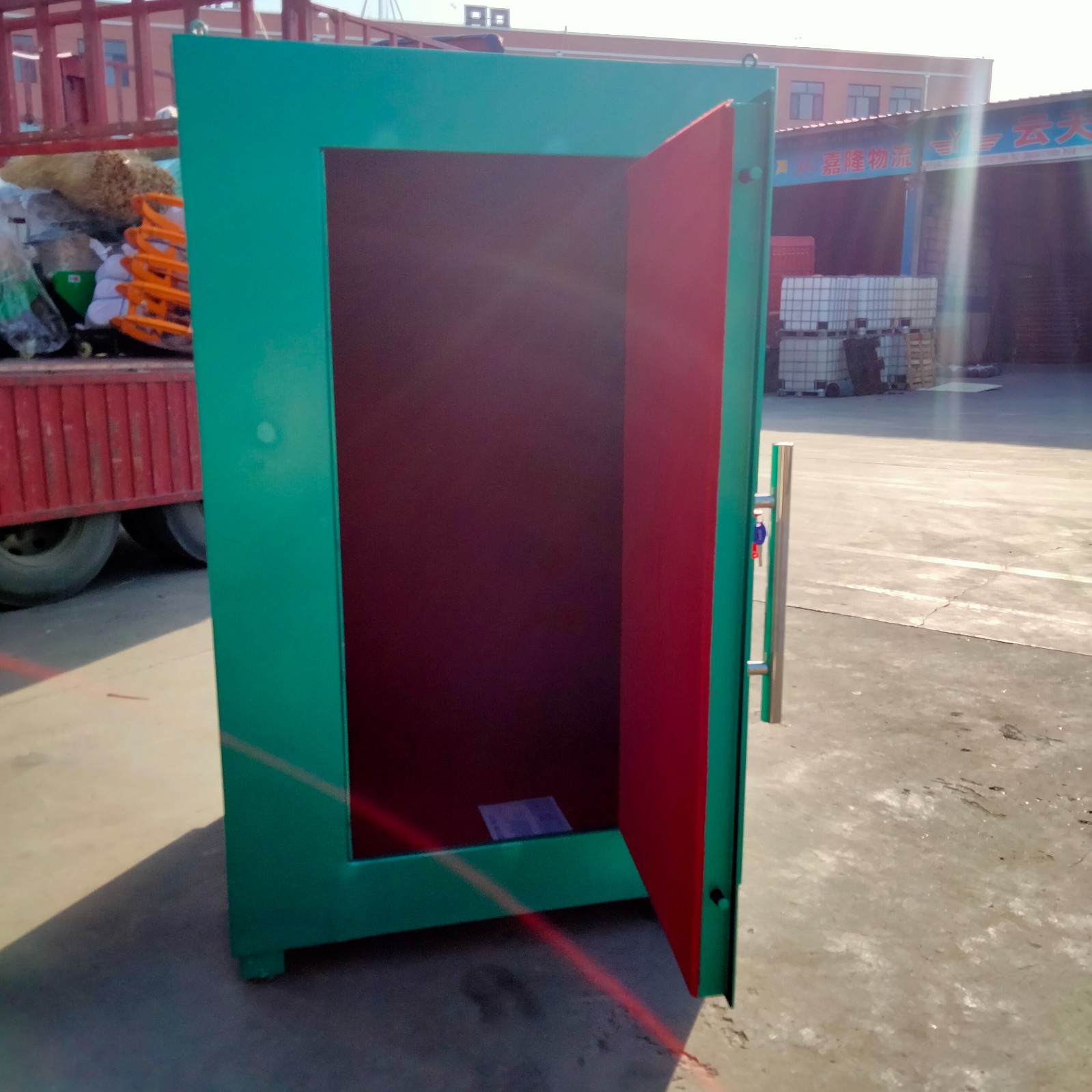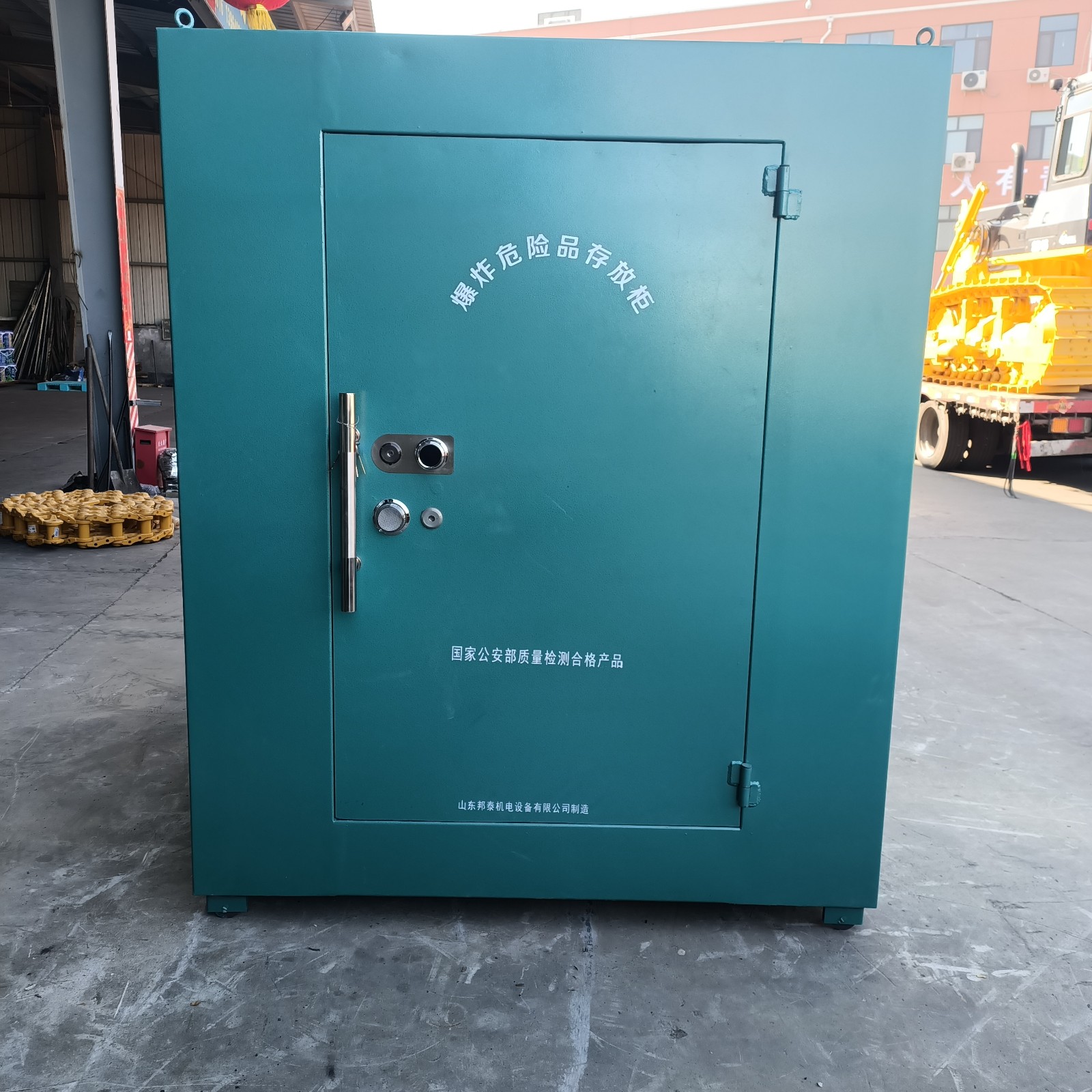 山東邦泰生產的火工品臨時存放庫,主體是由優質鋼板材料焊接而成,國標規格門板鋼板厚度不低于6mm厚,內部為木板內襯和防靜電阻燃氈墊。門扇鎖具為雙鎖聯動式,并安裝有一個機械密碼鎖,有效防盜,存放更安全。