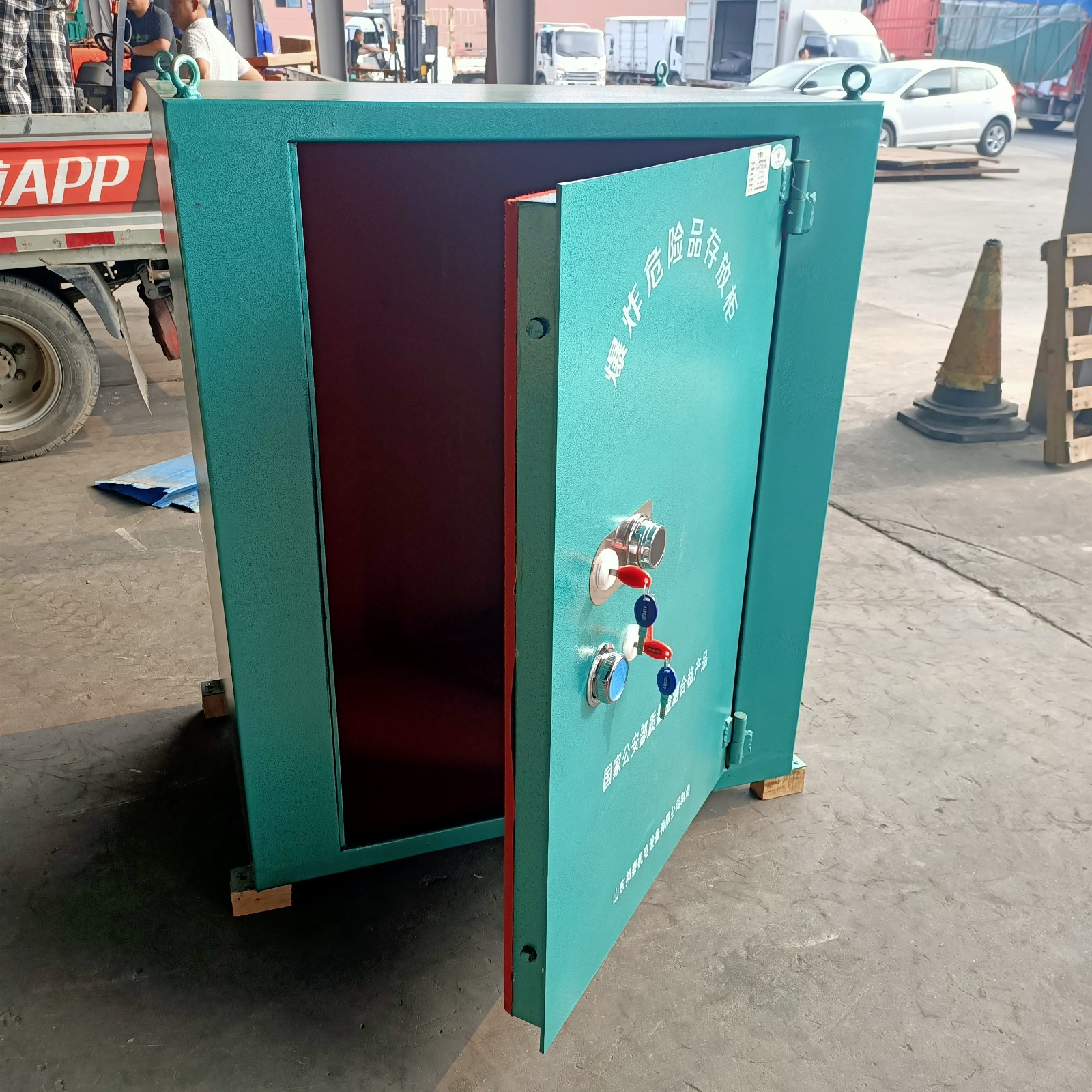 爆破器材臨時存放柜,適用于戶外施工中,從固定式存放庫中領取到爆破器材運輸?shù)绞┕c,存放柜可用于地面放置也可以用于放置在運輸車內進行運輸,注意放置在車內需利用繩子或者焊接方式固定好,避免路途顛簸造成的劇烈震動。