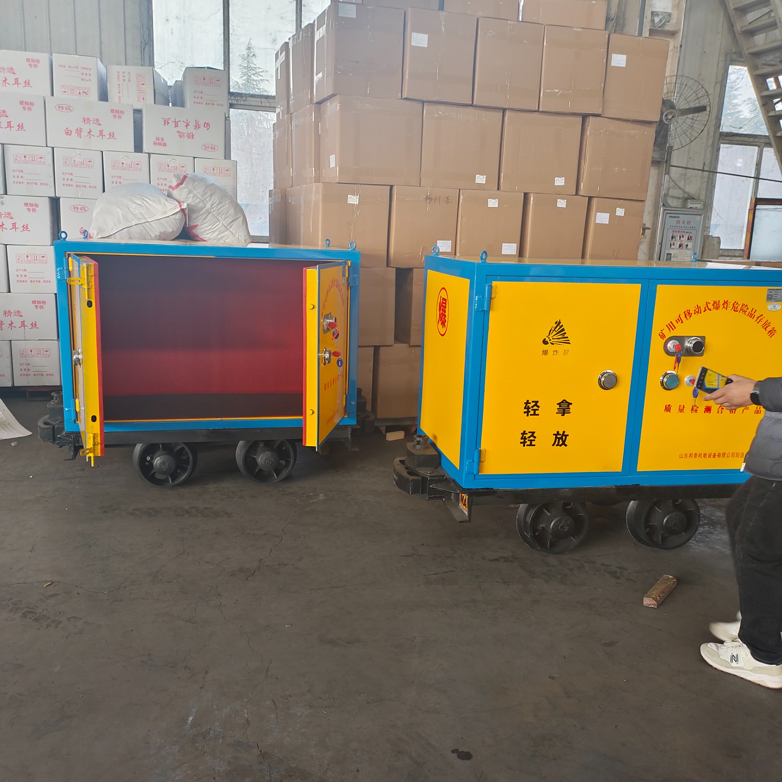 有軌式爆破器材箱是一種特殊的容器,能夠根據(jù)礦山軌道條件,運(yùn)輸量來進(jìn)行定制,從而確保施工的安全性和便捷。該運(yùn)輸軌道車需要利用礦山的牽引機(jī)車來實(shí)現(xiàn)行駛,短距離內(nèi)也可以手推,內(nèi)部鋪設(shè)有抗震防靜電軟墊,使內(nèi)部物品不易受到震動(dòng)和摩擦的影響,避免在運(yùn)輸過程中出現(xiàn)的多種安全問題,外部材質(zhì)是使用防爆鋼板焊接而成,堅(jiān)固、抗壓。