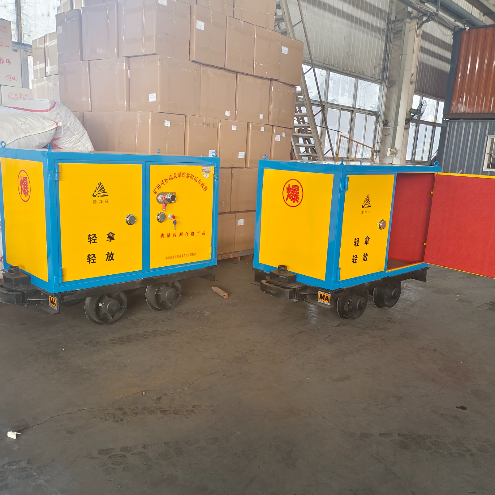 運輸廂是礦用爆破器材運輸車的一個重要組成部分。這種炸藥運輸廂外層采用優質鋼板焊接成型,內部做防靜電處理,由一層絕緣木板和防靜電阻燃氈墊整鋪貼合內部木質襯板,同時也具有一定的防震作用,這款在礦山現場具有重要的作用。它是為井下大量運輸炸藥而設計的一移動式儲存器。由于炸藥對運輸車輛所需安全要求很高,因此必須采用專業的有軌道炸藥車進行運輸。