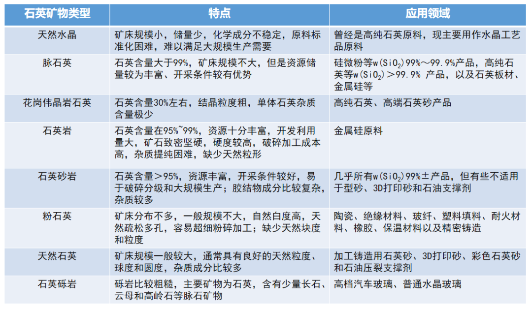 石英在自然界中的分布十分廣泛,成因多種多樣,目前石英礦物資源的主要類型有天然水晶、脈石英、花崗偉晶巖石英、石英巖、石英砂巖、粉石英、天然石英、石英礫巖等。目前,能夠用作高純石英原料的礦床工業類型有天然水晶、脈石英和花崗偉晶巖石英等。