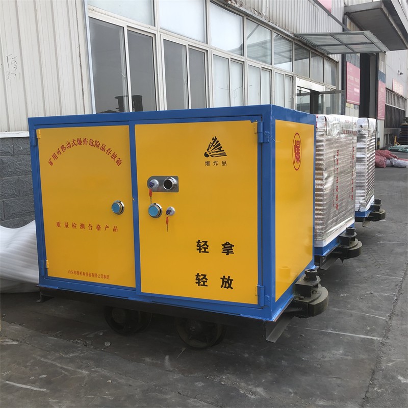 上半部分為外置6-8mm厚的防爆鋼板,內置10mm厚的絕緣木板及2.0mm的防靜電膠墊和抗震阻燃氈組成的礦用可移動式爆炸危險品存放箱;下半部分為可供600軌距、762軌距、900軌距軌道使用的礦用材料車。