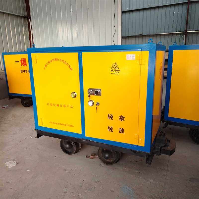 上半部分為外置6-8mm厚的防爆鋼板,內置10mm厚的絕緣木板及2.0mm的防靜電膠墊和抗震阻燃氈組成的礦用可移動式爆炸危險品存放箱;下半部分為可供600軌距、762軌距、900軌距軌道使用的礦用材料車。