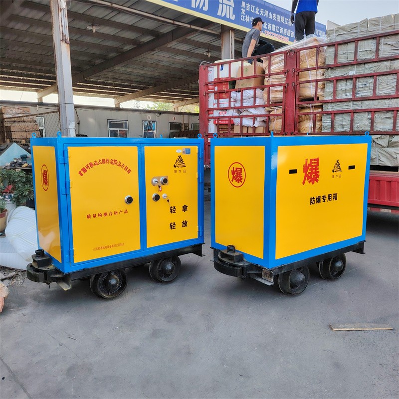 上半部分為外置6-8mm厚的防爆鋼板,內置10mm厚的絕緣木板及2.0mm的防靜電膠墊和抗震阻燃氈組成的礦用可移動式爆炸危險品存放箱;下半部分為可供600軌距、762軌距、900軌距軌道使用的礦用材料車。