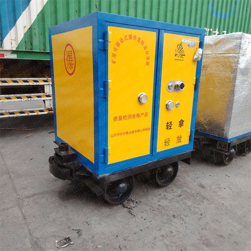 上半部分為外置6-8mm厚的防爆鋼板,內(nèi)置10mm厚的絕緣木板及2.0mm的防靜電膠墊和抗震阻燃?xì)纸M成的礦用可移動式爆炸危險品存放箱;下半部分為可供600軌距、762軌距、900軌距軌道使用的礦用材料車。