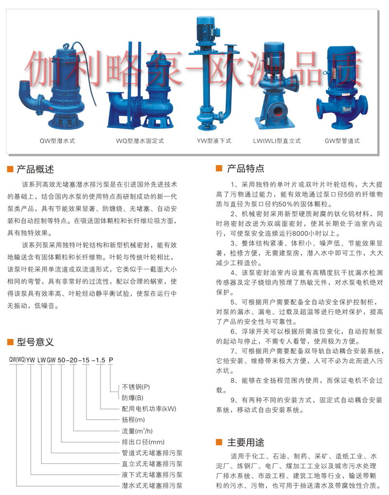 WQ系列無(wú)堵塞潛水排污泵適用用于工廠商業(yè)嚴(yán)重污染廢水的排放、主宅區(qū)的污水排污站、城市污水處理廠派水系統(tǒng)、人防系統(tǒng)排水站、自來(lái)水廠的給水設(shè)備、醫(yī)院、賓館的污水排放、市政工程建筑工地、礦山配套附機(jī)、農(nóng)村沼氣池、農(nóng)田灌溉等行業(yè),輸送帶顆粒的污水,污物,也可用于清水及帶弱腐蝕性介質(zhì)。