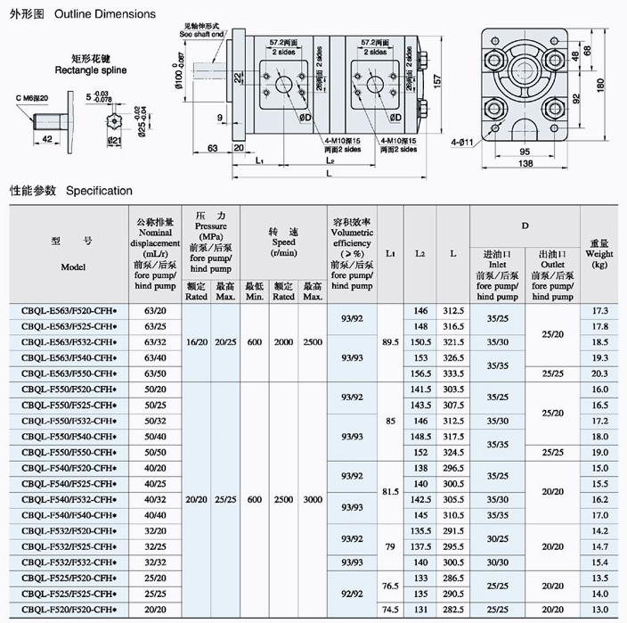 ??① 產品代號 Product code ??② 壓力等級 Pressure grade E: 16MPa F: 20MPa ??③ 齒輪模數 Gear modulus 5 ??④ 前泵公稱排量 Fore pump nominal displacement (mL/r) ??⑤ 后泵公稱排量 Hind pump nominal displacement (mL/r) ??⑥ 安裝形式 Mounting C: 矩形法蘭 Rectangle ??⑦ 油口形式 Joining port F: 法蘭聯接 Flange ??⑧ 軸伸形式 Shaft end H: 矩形花鍵 Rectangle spline ??⑨ 旋??向 Rotation L: 左旋 Left (逆時針 Counterclockwise) R: 右旋 Right (順時針 Clockwise is omitted) (省略)
