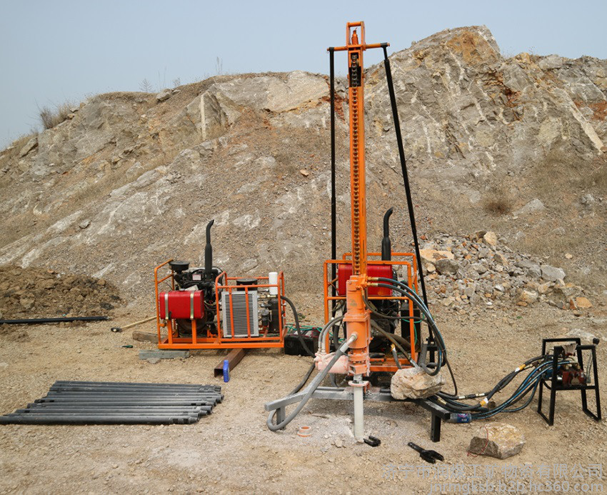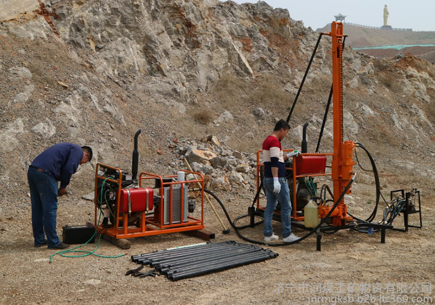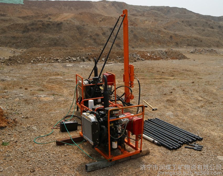 40型人抬鉆機主要適用于山地、黃土塬、丘陵、戈壁、農田等復雜地表的勘探鉆井。鉆機采用全液壓驅動,山地地區(qū)主要采用空氣鉆井和空氣震擊鉆井。在其它地區(qū),更換鉆具可實現螺旋鉆井,增加泥漿泵可實現泥漿鉆井。