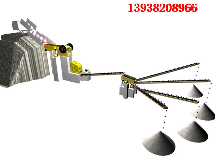 首先,石料由粗碎機進行初步破碎,然后,產成的粗料由膠帶輸送機輸送至細碎機進行進一步破碎,細碎后的石料進振動篩篩分出兩種石子,滿足制砂機進料粒度的石子進制砂機制砂,另一部分返料進細破。進制砂機的石子一部分制成砂,經洗砂機(可選)清洗后制成成品砂,另一部分進制砂機再次破碎。