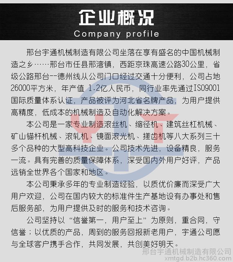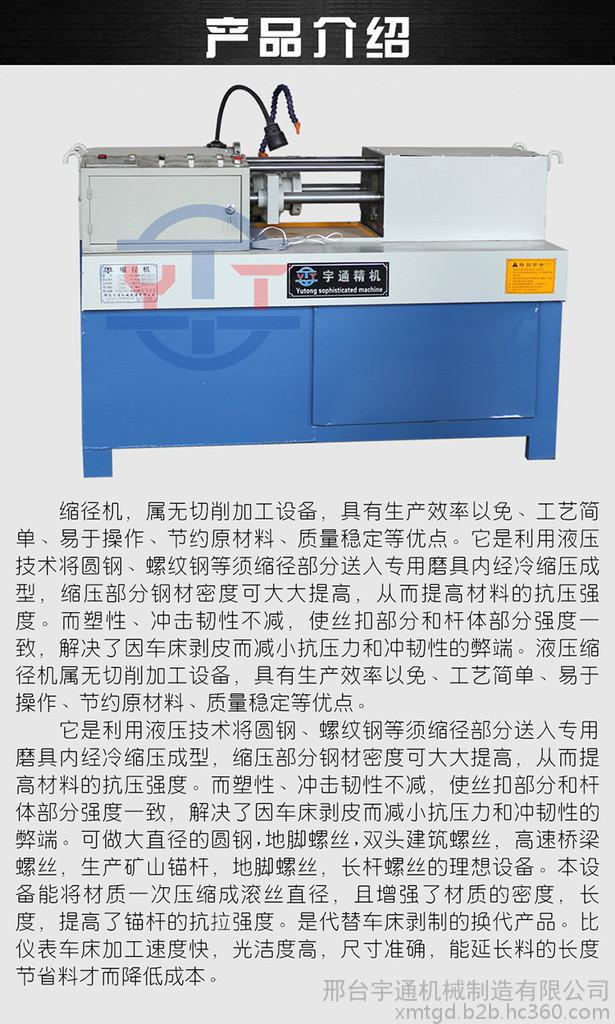 河北省邢臺宇通機械專業(yè)生產(chǎn)滾絲機,三軸滾絲機,大型滾絲機,縮徑機。尤其**開發(fā)出幾種新型滾絲機,大型滾絲機,在精度上與加工范圍內(nèi)得到了質(zhì)的飛躍,可根據(jù)各廠家的不同要求特殊設計制造非標機型來滿足客戶。