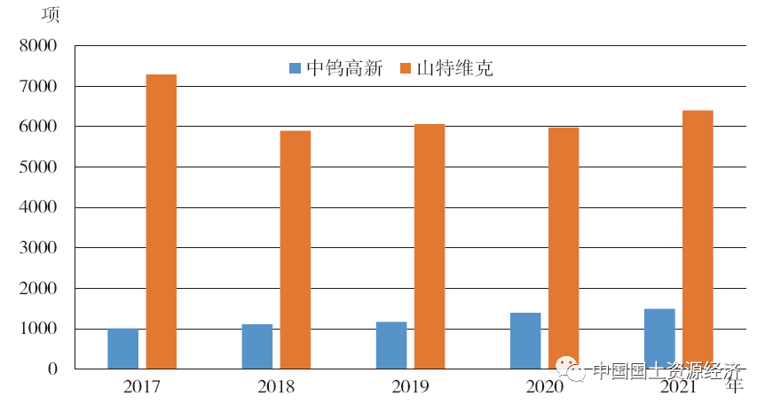 圖4 2017—2021年中鎢高新與山特維克有效專利對比