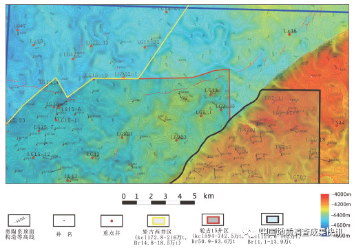 前期塔里木油田利用容積法對(duì)油氣探明儲(chǔ)量進(jìn)行了系統(tǒng)計(jì)算,本次在解剖分析地質(zhì)背景、巖石特征及儲(chǔ)層特征的基礎(chǔ)上,利用含水飽和度進(jìn)行類比,對(duì)輪古地區(qū)油田水資源進(jìn)行了估算。輪古油田分為3個(gè)作業(yè)區(qū)(圖2):輪古西井區(qū)、輪古15井區(qū)和輪古7井區(qū)。以輪古西井區(qū)為例, 該井區(qū)探明石油儲(chǔ)量為1600萬(wàn)t,平均孔隙度為9%,平均滲透率為0.316×10-3μm2,平均含水飽和度為95.2%~96.8%,計(jì)算得到水資源量為64000萬(wàn)~80000萬(wàn)t,按照平均KCl含量0 . 2 7%計(jì)算,輪古西井區(qū)KCl資源量為86.4萬(wàn)~129.6萬(wàn)t;按平均Br含量232mg/L計(jì)算,Br資源量為7.4萬(wàn)~9.3萬(wàn)t。同樣方法計(jì)算出輪古15井區(qū)KCl資源量為297萬(wàn)~445.5萬(wàn)t,Br資源量為25.5萬(wàn)~38.3萬(wàn)t;輪古7井區(qū)KCl資源量為64.8萬(wàn)~97.2萬(wàn)t,Br資源量為5.6萬(wàn)~8.4萬(wàn)t。最終獲得整個(gè)輪古地區(qū)KCl資源量為446.4萬(wàn)~672.7萬(wàn)t,達(dá)到中小型鉀鹽礦床的規(guī)模;Br資源量為38.5萬(wàn)~56萬(wàn)t,達(dá)到超大型溴資源礦床規(guī)模。