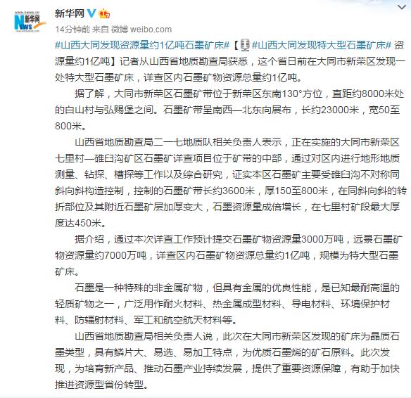 山西省地質勘查局相關負責人說,此次在大同市新榮區發現的礦床為晶質石墨類型,具有鱗片大、易選、易加工特點,為優質石墨烯的礦石原料。此次發現,為培育新產品、推動石墨產業持續發展,提供了重要資源保障,有助于加快推進資源型省份轉型。