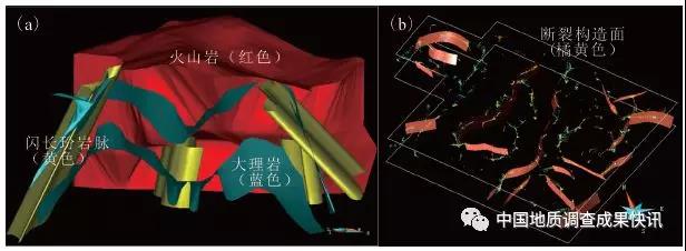 (4)建立了雙尖子山和白音諾爾礦區三維地質模型和研究區區域地質框架模型。以主要賦礦地質體和成礦地質體為建模單元,建立了雙尖子山礦區(圖2)和白音諾爾礦區(圖3-a)三維地質模型,另外,建立了研究區區域地質框架模型(圖3-b),為深部找礦和勘查提供地質和物性信息。