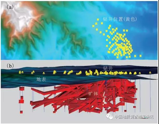 a—地表高程和鉆井位置分布圖;b—三維地質模型圖
