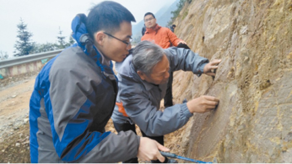 盡管盤古山上氣溫極低,幾位隨行的年輕小伙子都頻頻地打寒顫,可陳院士的工作熱情絲毫沒有減弱。車子剛停穩,他便馬上查看區域地質圖、礦區地質圖、地質剖面圖,詢問礦化標志帶的基本情況。聽完匯報后,陳院士便拿起地質錘和放大鏡,敲一下再看一下,一絲不茍地觀察細脈中礦物組合,還不忘給身旁的年輕人詳細講解觀察到的各種現象,提醒其學生務必準確測量礦化標志帶的點位、厚度、產狀,并通過顯微鏡及時鑒定其中的礦物組合和品位。