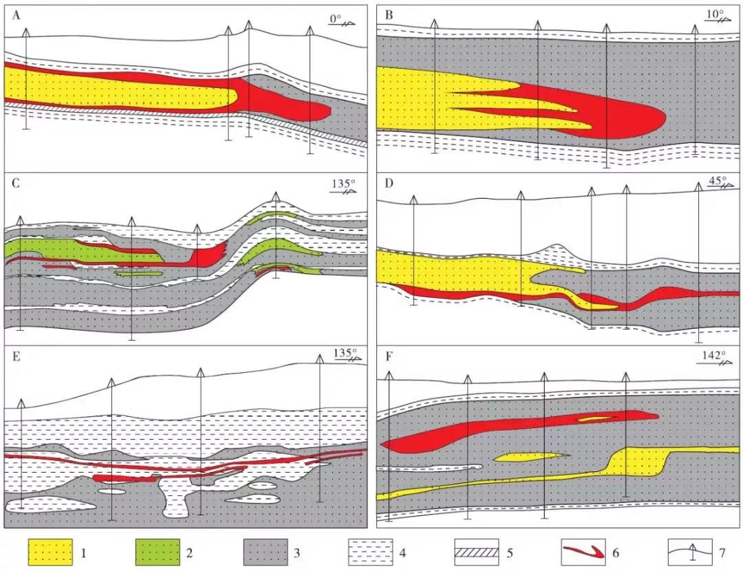 A-典型層間氧化帶卷狀礦體(伊犁);B-層間氧化帶復(fù)雜卷狀礦體(吐哈);C-先氧化后油氣還原的復(fù)雜礦體(鄂爾多斯);D-潛水-層間氧化帶長翼狀卷狀礦體(二連);E-沉積成巖板狀礦體(二連);F-滲入氧化滲出還原共同作用的透鏡狀礦體(松遼):1-黃色氧化帶;2-綠色氧化帶;3-灰色還原帶;4-泥巖;5-煤層;6-鈾礦體;7-鉆孔