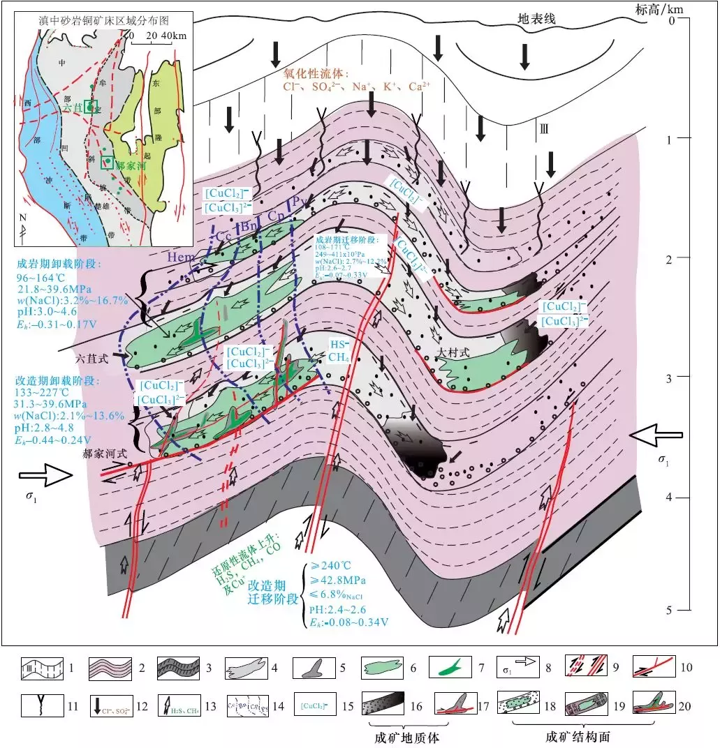 1-含鹽建造;2-含銅建造;3-含煤建造;4-成巖期層狀蝕變;5-構(gòu)造期脈狀蝕變;6-層狀銅礦體;7-脈狀銅礦體;8-區(qū)域主壓應(yīng)力方向;9-同生斷裂;10-層間及切層斷裂;11-近地表張性裂隙;12-氧化性流體;13-還原性流體;14-金屬礦物分帶;15-銅絡(luò)合物遷移方式;16-特定巖性-巖相組合的淺-紫交互帶;17-構(gòu)造熱液蝕變體;18-巖性-巖相界面;19-物理化學(xué)界面;20-斷裂構(gòu)造結(jié)構(gòu)面礦物分帶及元素異常組合: 赤鐵礦帶(Hem): Sb-Hg;輝銅礦帶(Cc): Cu-V-Hg;斑銅礦帶(Bn): Cu-Ag-As-Sb;黃銅礦帶(Cp): Ag-Sb-Ni-Co;黃鐵礦帶(Py): Pb-Zn