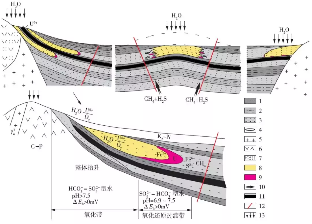 1-泥巖;2-泥質(zhì)砂巖;3-砂巖;4-油氣改造砂巖;5-花崗巖;6-火山巖;7-凝灰?guī)r;8-氧化帶;9-鈾礦體;10-有機(jī)流體運(yùn)移方向;11-煤層;12-斷裂;13-大氣降水