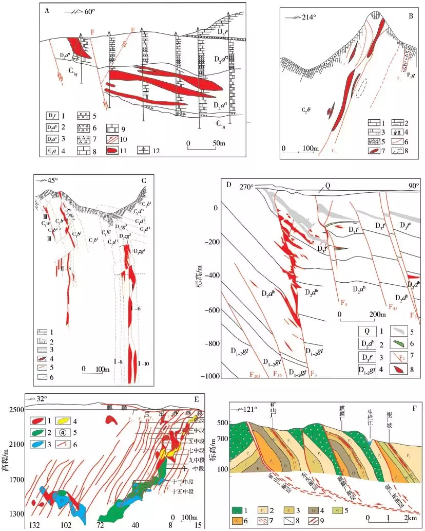 A-廣西泗頂鉛鋅礦(據(jù)王劍和寧浦功,1998);B-青山鉛鋅礦(據(jù)桂林工學(xué)院,2005);C-昭通毛坪鉛鋅礦(據(jù)柳賀昌和林文達(dá),1999);D-廣東凡口鉛鋅礦(據(jù)祝新友等,2012);E-會澤鉛鋅礦(據(jù)韓潤生等,2006);F-會澤鉛鋅礦(據(jù)韓潤生等,2012)