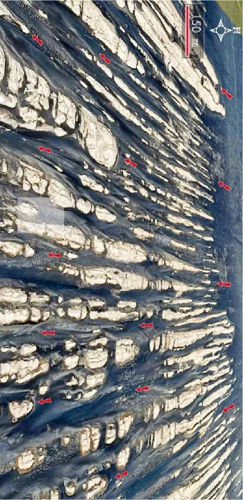 通過谷歌地球(GoogleEarth)從空中俯瞰,一排排風蝕壟脊恰似大海中的艦隊,又似巨型的鯨群,你爭我趕地向前行進,蔚為壯觀(圖1)。受構造作用、巖石的原始成份以及風蝕作用和間歇性流水作用的共同影響,宏觀上的壟脊常呈不規則狀斷開,在風沙的長期吹蝕和磨蝕下形成形態不同的地貌景觀,有的如潛艇,有的像蝌蚪,有的像獅子,有的像孔雀,有的像柱子,有的像蘑菇,千奇百怪。