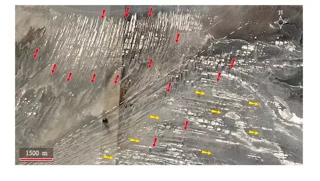 照片左上部分為標準的雅丹地貌,第四紀河湖相沉積物在烈風吹蝕下形成白色的長壟狀地貌,地貌形態與當地的盛行風向(紅色箭頭)一致(參見圖1)。照片右下部分近東西向出露的白色壟狀地貌為間歇性水流沖蝕而成(如黃色箭頭所示),與現在的盛行風向幾乎垂直,因此常常被吹裂,形成孤立的地貌景觀。從本質上講,羅布泊地區的水陸變遷、流水與風的侵蝕作用等等均與青藏高原的隆升密切相關,地球表面的面貌(地貌)是地質運動的結果。羅布泊地區獨特的地質背景造成了其獨特的地貌景觀。