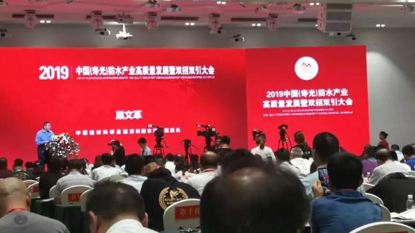 6月20日,由中國(guó)建筑防水協(xié)會(huì)、壽光市防水行業(yè)協(xié)會(huì)主辦的“2019中國(guó)(壽光)防水產(chǎn)業(yè)高質(zhì)量發(fā)展暨雙招雙引大會(huì)”在壽光市萬(wàn)華酒店舉行。中國(guó)建筑防水協(xié)會(huì)、中國(guó)建材科學(xué)研究總院蘇州防水研究院、國(guó)家建材工業(yè)建筑防水材料產(chǎn)品質(zhì)量監(jiān)督檢驗(yàn)測(cè)試中心、中國(guó)硅酸鹽學(xué)會(huì)房建材料分會(huì)防水保溫材料專委會(huì)、中建材蘇州非礦院防水設(shè)計(jì)研究所、臺(tái)灣營(yíng)建防水技術(shù)協(xié)進(jìn)會(huì)、韓國(guó)建筑施工學(xué)會(huì)、韓國(guó)首爾科技大學(xué)以及來(lái)自全國(guó)各地的行業(yè)協(xié)會(huì)、科研院校、新聞媒體、房地產(chǎn)商、原材料供應(yīng)商,加拿大、印度、泰國(guó)及港澳臺(tái)企業(yè)和協(xié)會(huì)全體會(huì)員單位等近千名嘉賓參會(huì)。