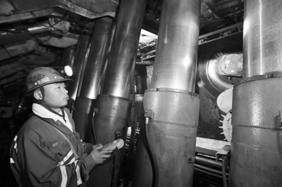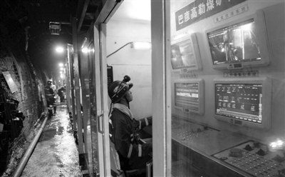 上圖技術人員在地下600多米的智能監控中心里調試設備。