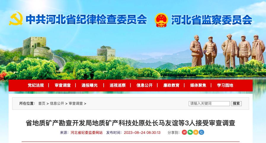 8月24日,河北省紀(jì)委監(jiān)委通報,河北省地質(zhì)礦產(chǎn)勘查開發(fā)局(以下稱“河北省地礦局”)地質(zhì)礦產(chǎn)科技處原處長馬友誼、省地質(zhì)礦產(chǎn)勘查開發(fā)局第三地質(zhì)大隊(河北省張承地區(qū)生態(tài)環(huán)境保護與修復(fù)技術(shù)創(chuàng)新中心)副隊長劉月東、中國地質(zhì)環(huán)境監(jiān)測院人事處處長李志強涉嫌嚴(yán)重違紀(jì)違法,目前正接受省紀(jì)委監(jiān)委紀(jì)律審查和監(jiān)察調(diào)查。