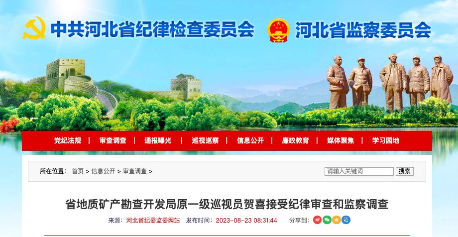 8月23日,河北省紀(jì)委監(jiān)委通報,河北省地礦局原一級巡視員賀喜涉嫌嚴(yán)重違紀(jì)違法,目前正接受省紀(jì)委監(jiān)委紀(jì)律審查和監(jiān)察調(diào)查。