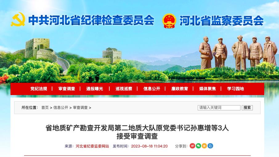 8月18日,河北省紀(jì)委監(jiān)委通報,河北省地礦局第二地質(zhì)大隊原黨委書記孫惠增,省地礦局第三地質(zhì)大隊黨委書記武曉紅,河北地礦科技開發(fā)總公司原黨委書記、總經(jīng)理杜光涉嫌嚴(yán)重違紀(jì)違法,目前正接受省紀(jì)委監(jiān)委紀(jì)律審查和監(jiān)察調(diào)查。
