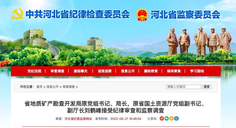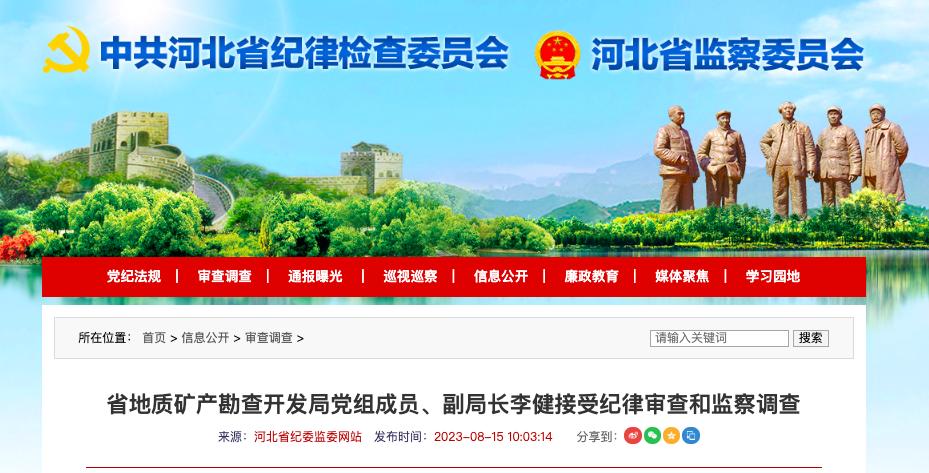 除賀喜和李健外,河北省地礦局還有兩名廳官在此之前已落馬。今年6月21日,河北省紀(jì)委監(jiān)委發(fā)布消息稱,省地礦局原黨組書記、局長,原省國土資源廳黨組副書記、副廳長劉鶴峰;省地礦局原黨組成員、總經(jīng)濟師郭榮麟涉嫌嚴(yán)重違紀(jì)違法,目前正接受省紀(jì)委監(jiān)委紀(jì)律審查和監(jiān)察調(diào)查。
