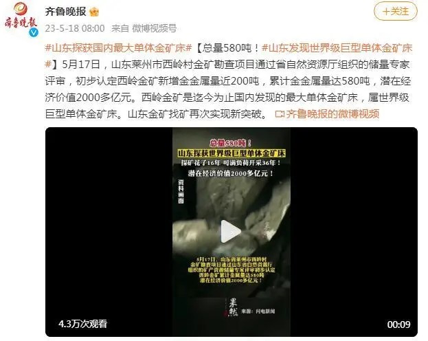 本文轉自【齊魯晚報】: 5月17日,山東萊州市西嶺村金礦勘查項目通過省自然資源廳組織的儲量專家評審,初步認定西嶺金礦新增金金屬量近200噸,累計金金屬量達580噸,潛在經濟價值2000多億元。西嶺金礦是迄今為止國內發現的最大單體金礦床,屬世界級巨型單體金礦床。山東金礦找礦再次實現新突破。