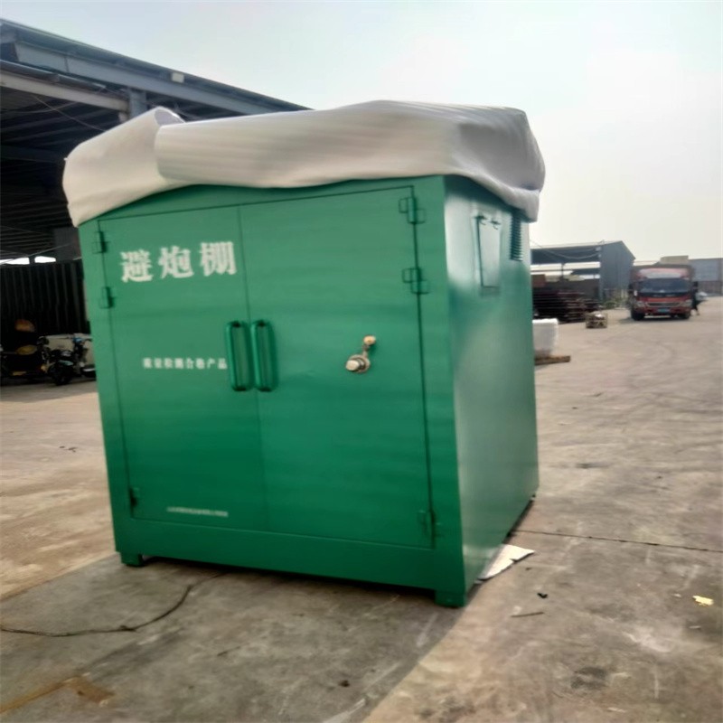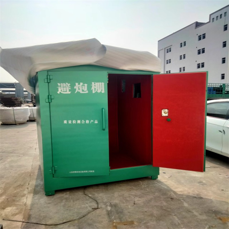 BTJD-001型防爆避炮棚(可移動(dòng)式安全防護(hù)棚),按標(biāo)準(zhǔn)至少需要門板6-10mm厚防爆鋼板可防止大部分的碎石落石沖擊,內(nèi)襯絕緣木板,內(nèi)部鋪設(shè)阻燃防靜電墊,具有抗震抗靜電作用。避炮棚設(shè)置有通氣窗和觀察窗十分方便觀察現(xiàn)場情況。內(nèi)外可開鎖方便人員進(jìn)出,設(shè)有通氣孔方便躲避人員呼吸,一面設(shè)有觀察窗方便觀察情況。