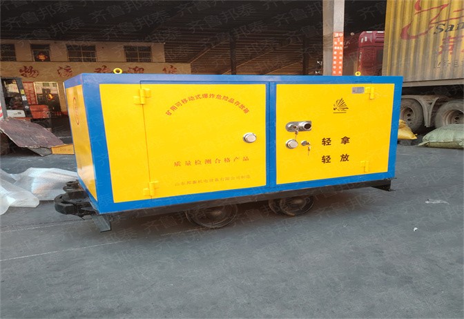 礦用可移動式井下有軌炸藥運輸車其組成上半部分為外置6-8mm厚的防爆鋼板,內置10mm厚的絕緣木板及2.0mm的防靜電膠墊和抗震阻燃氈組成的礦用可移動式爆炸危險品存放箱;下半部分為可供600軌距、762軌距、900軌距軌道使用的礦用材料車。