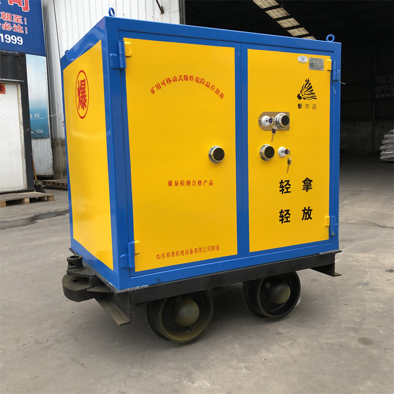火工品有軌運輸車,也被稱作礦車炸藥箱、有軌運輸雷管車或礦用炸藥車,通常由兩大部分構成:一部分是由外置防爆鋼板制成的存放柜,用于安全儲存火工品,防爆鋼板厚度一般不低于6mm,能有效抵御外界可能的沖擊和爆炸威脅;另一部分是專用的材料車,負責承載存放柜在軌道上行駛。材料車配有牽引裝置,可將多臺礦車連接成車組進行運輸。