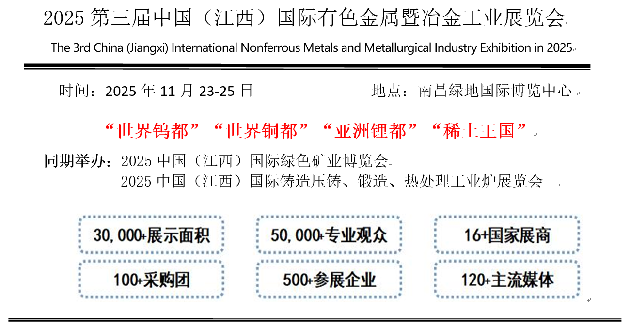 為促進江西省有色金屬產業健康發展、促進對外經貿合作,引導江西省有色金屬產業與國際接軌,組委會在與政府主管部門/行業協會多次深入基層調研市場、項目分析后決定于2025年11月23-25日在南昌綠地國際博覽中心召開“2025中國(江西)國際有色金屬暨冶金工業展覽會”我們不見不散。