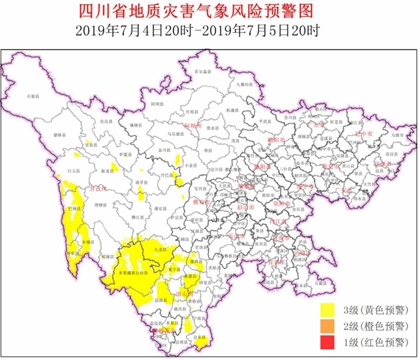 四川在線消息(記者 寇敏芳)7月4日,省自然資源廳發布全省地質災害氣象風險預警。結合四川省氣象臺天氣預報情況,7月4日20時~7月5日20時,全省地質災害氣象風險預警等級為3級(黃色預警,注意級),具體結果如下: