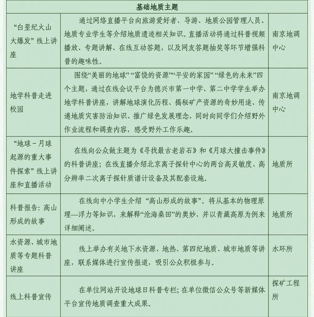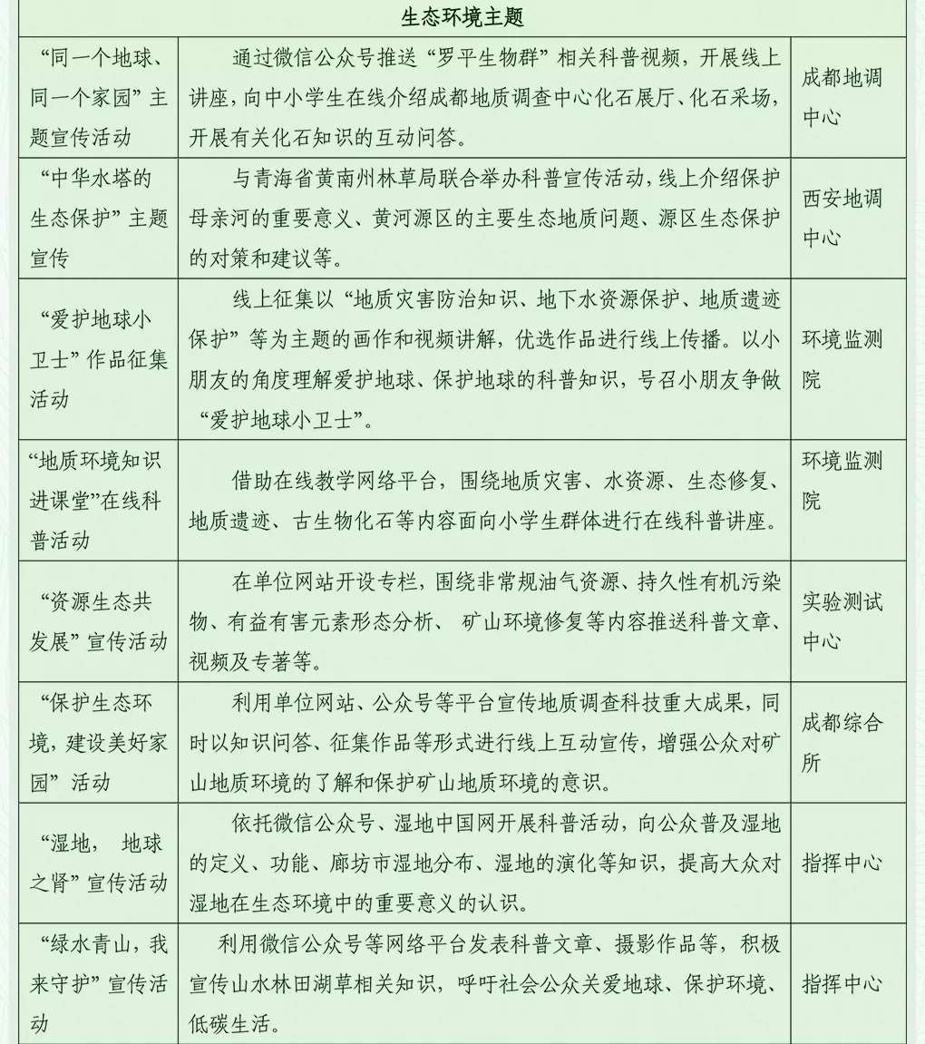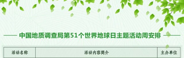 2020年4月22日是第51個世界地球日,主題為“珍愛地球 人與自然和諧共生”。為貫徹提出的“科技創(chuàng)新、科學(xué)普及是實現(xiàn)創(chuàng)新發(fā)展的兩翼”重要指示精神,自然資源部中國地質(zhì)調(diào)查局結(jié)合各地區(qū)疫情防控要求和實際情況,圍繞宣傳主題和局中心工作,積極開展地球日主題宣傳活動。