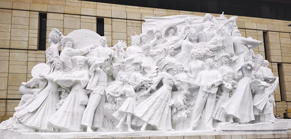 記者跟隨隊(duì)伍進(jìn)入館區(qū),首先映入眼簾的是展覽館廣場(chǎng)上矗立的五大主題雕塑,分別為《旗幟》《信仰》《偉業(yè)》《攻堅(jiān)》《追夢(mèng)》,76個(gè)人物與583塊漢白玉融為一體,靜靜地講述著中國(guó)共產(chǎn)黨一百年來(lái)為人民謀幸福、為民族謀復(fù)興的偉大歷程。記者在采訪中了解到,為了尋找合適的漢白玉石材,相關(guān)團(tuán)隊(duì)奔赴全國(guó)各地的礦坑實(shí)地查看石材質(zhì)量,最終選定四川雅安夾金山腳下的漢白玉。一塊塊精選的漢白玉也在默默地訴說(shuō)著中國(guó)礦業(yè)與中國(guó)共產(chǎn)黨命運(yùn)與共的深厚情緣。